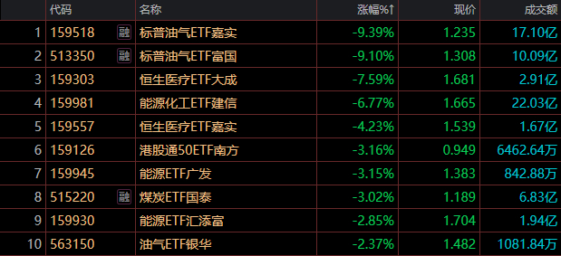 标普油气ETF(159518)领跌9.39%,标普油气ETF(513350)跌9.1%,恒生医疗ETF(159303)跌7.59%。