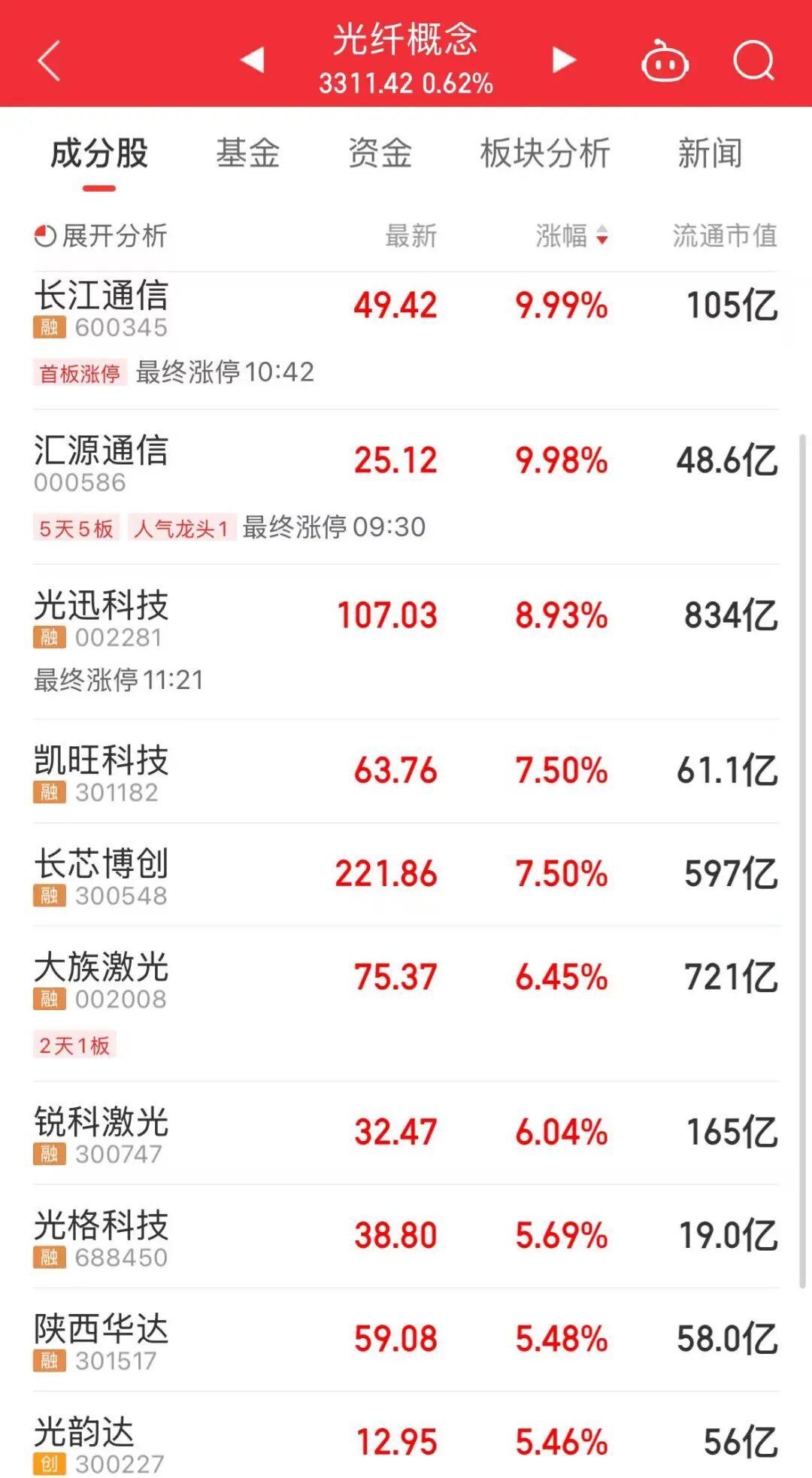 光纤和光模块板块带动算力产业链走强,液冷服务器、PCB等板块也上涨。