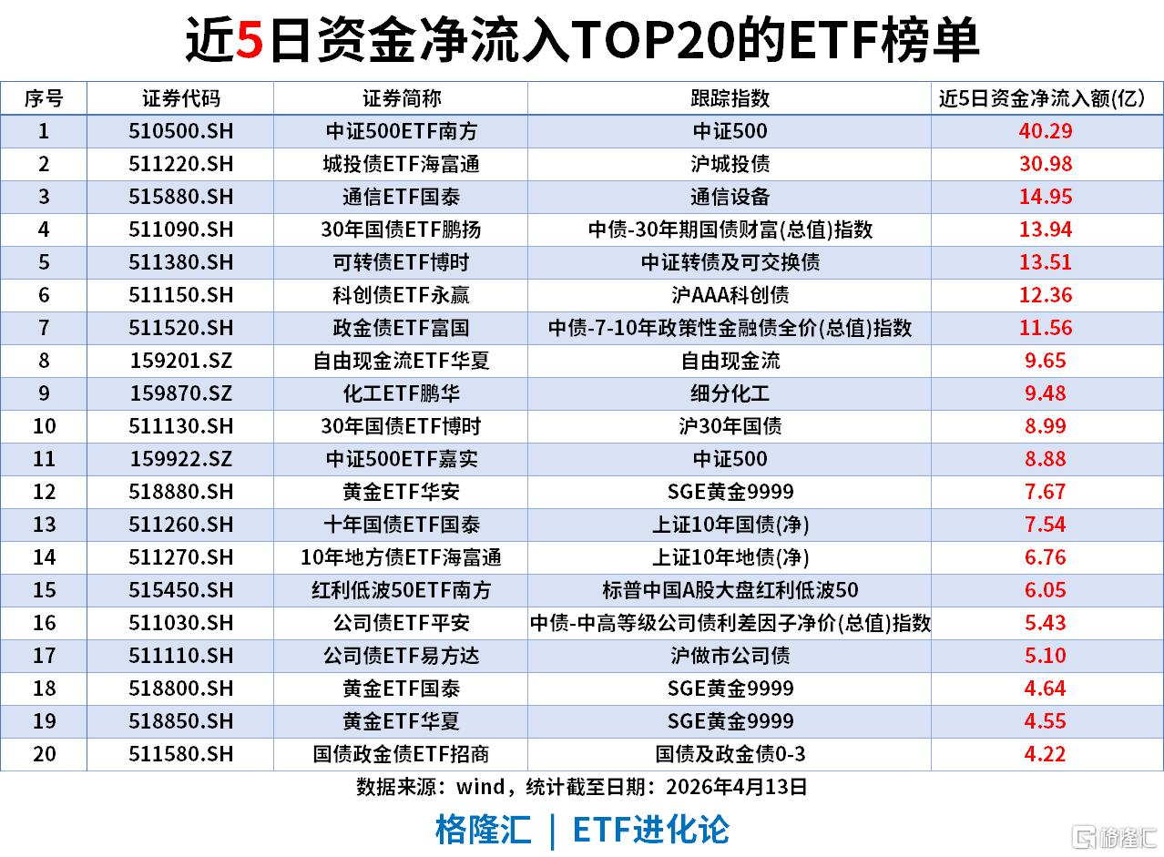 中长期资金形成固收防御、宽基与成长均衡配置的清晰格局:城投债ETF海富通以105.19亿净流入登顶,中证500ETF南方以67.22亿净流入位列第三。