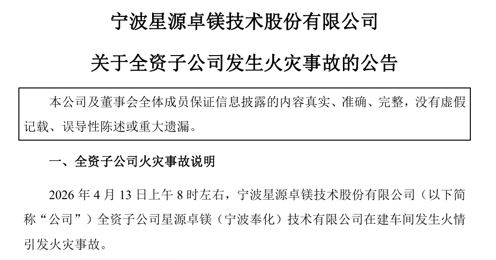 4月14日晚间,星源卓镁发布公告称,4月13日上午8时左右,公司全资子公司星源卓镁(宁波奉化)技术有限公司在建车间发生火情引发火灾事故。