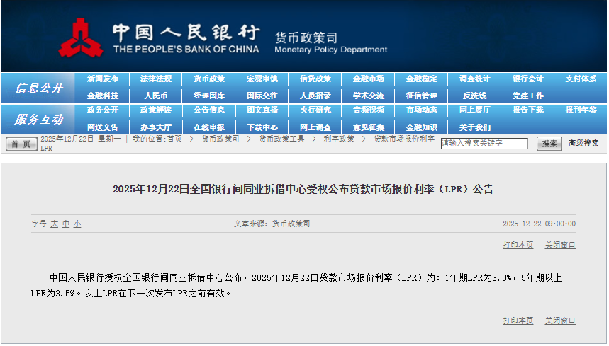 12月22日9时,中国人民银行授权全国银行间同业拆借中心公布,2025年12月22日贷款市场报价利率(LPR)为:1年期LPR为3.0%,5年期以上LPR为3.5%。以上LPR在下一次发布LPR之前有效。