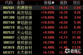 港A铝业股全线走高。A股中,利源股份、闽发铝业(4.26 +10.08%)、怡球资源、常铝股份、南山铝业、天山铝业6股涨停,云铝股份、鼎胜新材等跟涨。