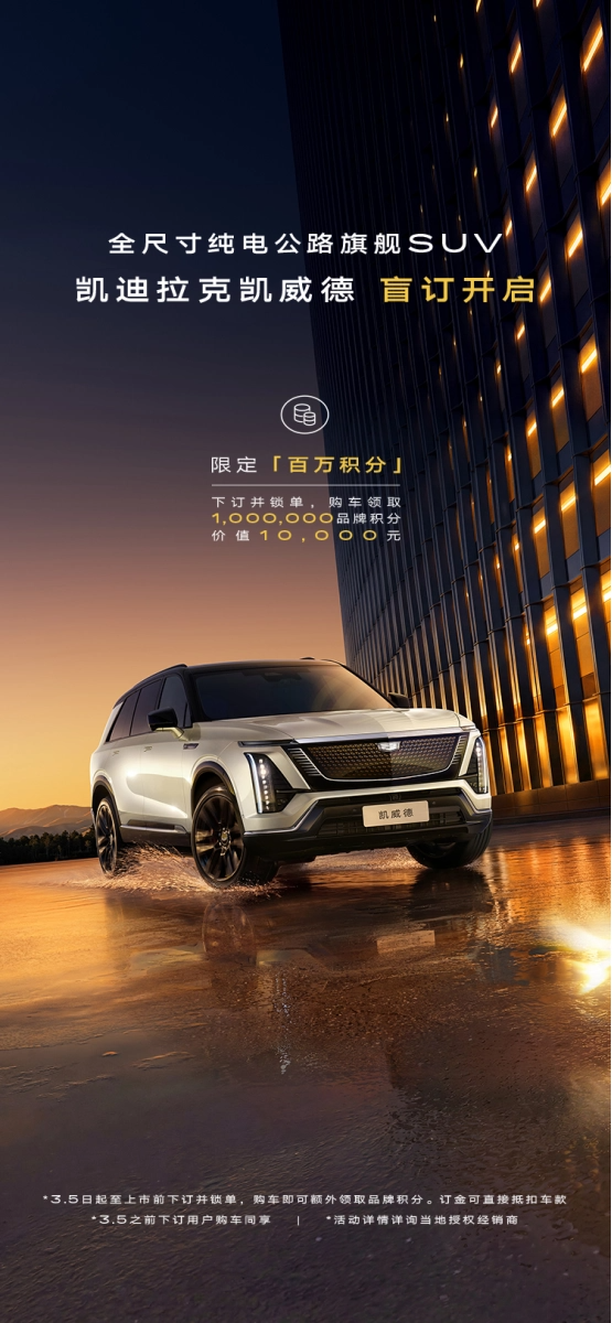 这一定价策略清晰表明,凯威德无意参与低价竞争,而是旨在以扎实且不容妥协的硬核产品力,在 2026 年春季的新车阵容中,成为一个融合顶尖智能、豪华体验与强悍性能的“高价值密度”标杆选项。它的入局,也标志着高端新能源市场的竞争,正深入至由全域硬核配置清单所决定的综合成本与价值较量新阶段。目前,官方配套的盲订权益为:即日起至上市前一天,下定并锁单用户可获 1,000,000 品牌积分(价值 10,000 元),这进一步印证了其高端的市场定位与价值信心。