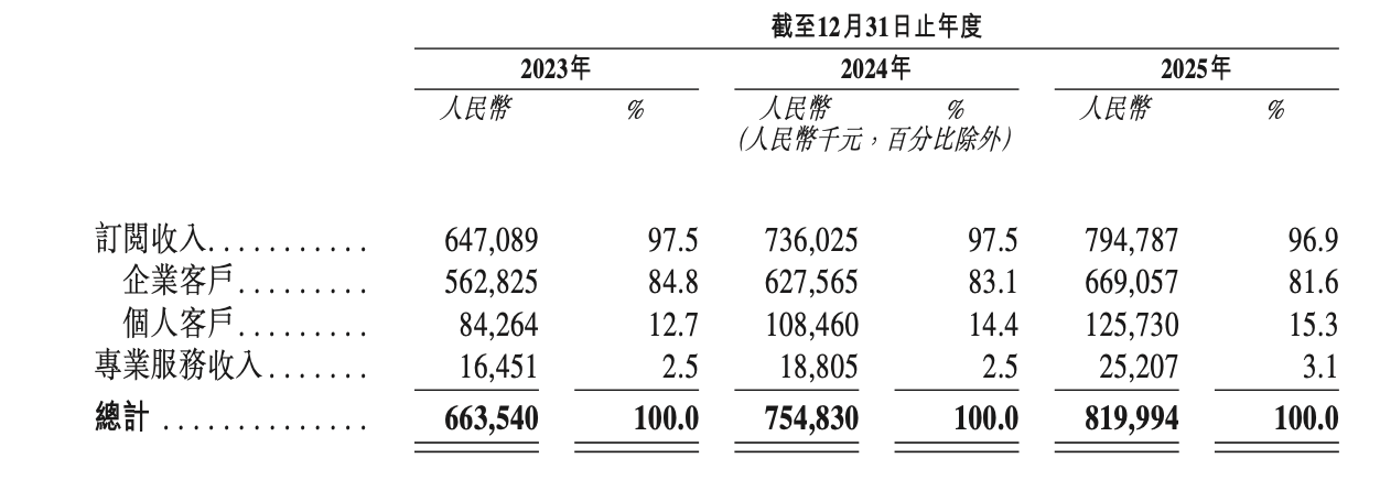 公司将收入划分为“订阅收入”和“专业服务收入”两大类,2023年-2025年,订阅收入(个人客户+企业客户)分别贡献了97.5%、97.5%和96.9%的营收,占据绝对领先地位。