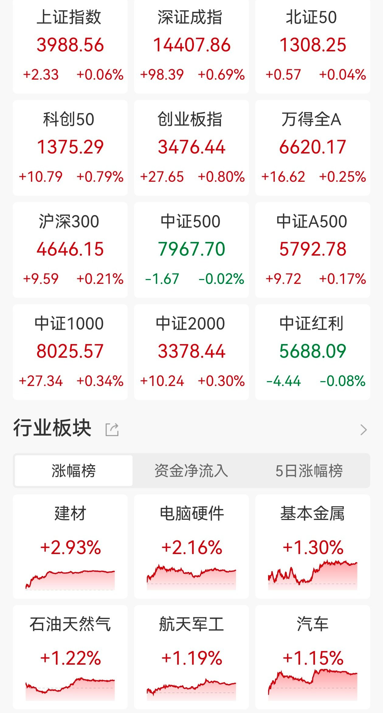 A股三大指数今日集体上涨,截至收盘,沪指涨0.06%报3988点,深证成指涨0.69%,创业板指涨0.8%续创逾4年新高。全市场成交额2.16万亿元,较前一交易日缩量1745亿元,超2900股下跌。