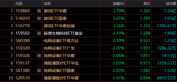 游戏ETF(159869)领跌3.7%,游戏ETF(516010)跌3.65%,游戏ETF(516770)跌3.56%。