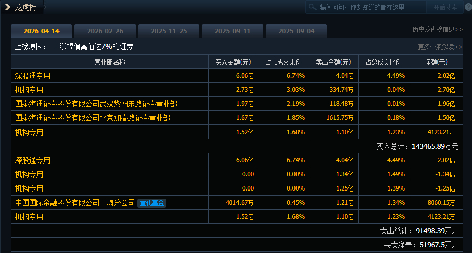 沪电股份今日涨停,成交额89.99亿元,换手率4.88%,盘后龙虎榜数据显示,深股通专用席位买入6.06亿元并卖出4.04亿元,2家机构专用席位净买入3.11亿元,有2家机构专用席位净卖出2.59亿元。